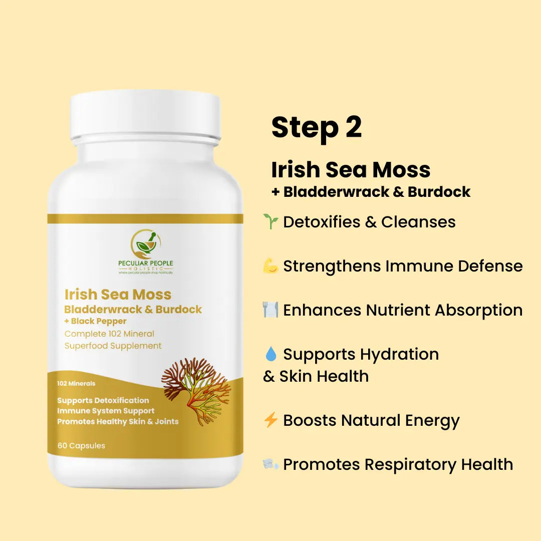 - Take the Irish Sea Moss, Bladderwrack & Burdock Root Capsules daily to restore minerals, boost immunity, and support digestion.